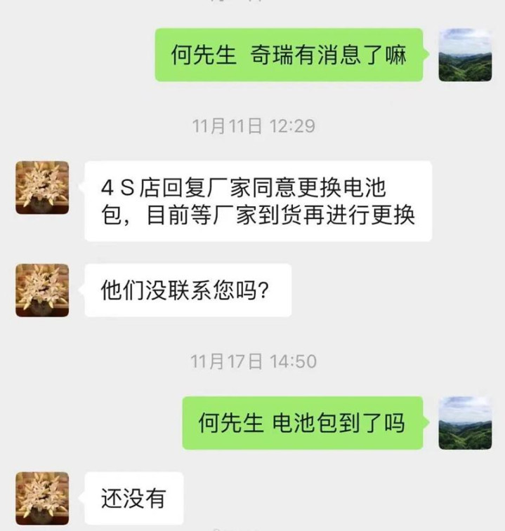 经过媒体持续跟进,杭州某奇瑞4S店最终同意更换新电池包,但车主需等配件。12月5号,何先生接到4S店电话,称电池包已到店,确认没问题后可安装。然而,何先生到店后发现,所谓全新电池包竟是2019年生产,且有磨损痕迹。何先生认为,自己2021年买的车,换19年生产的电池包不合理。